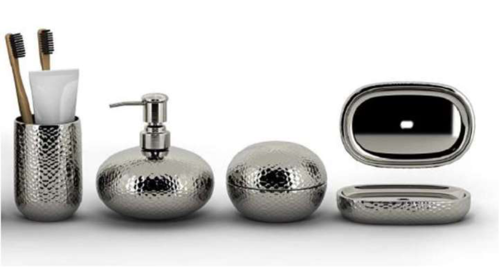 Elevate your bathroom decor with this new Asta bathroom countertop line. Contemporary and chic, these ceramic pieces feature an electroplate finish with a hammered steel effect.Complete the look by pairing the tumbler with the matching cotton jar, soap pump and soap dish.