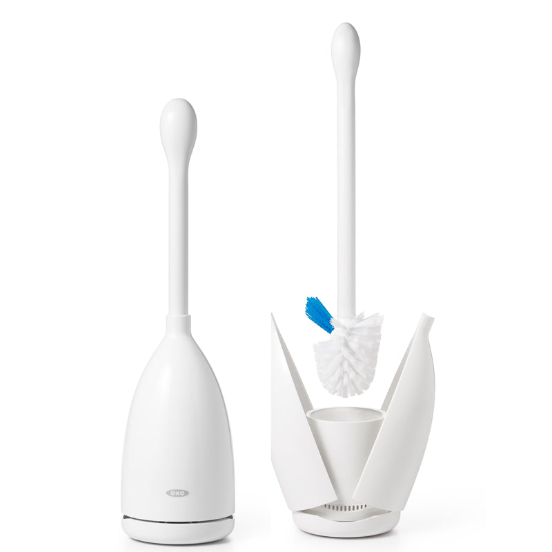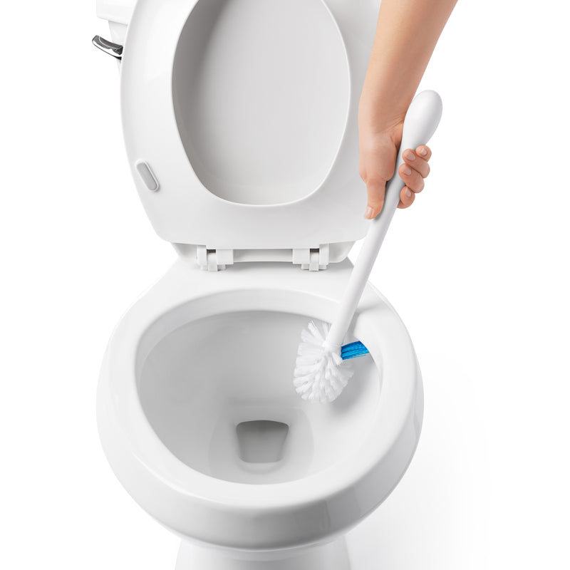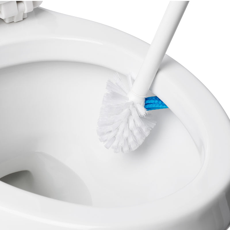 - A newly designed cleaning brush features stiff, turned-up bristles that effectively clean the underside rim of the toilet bowl.