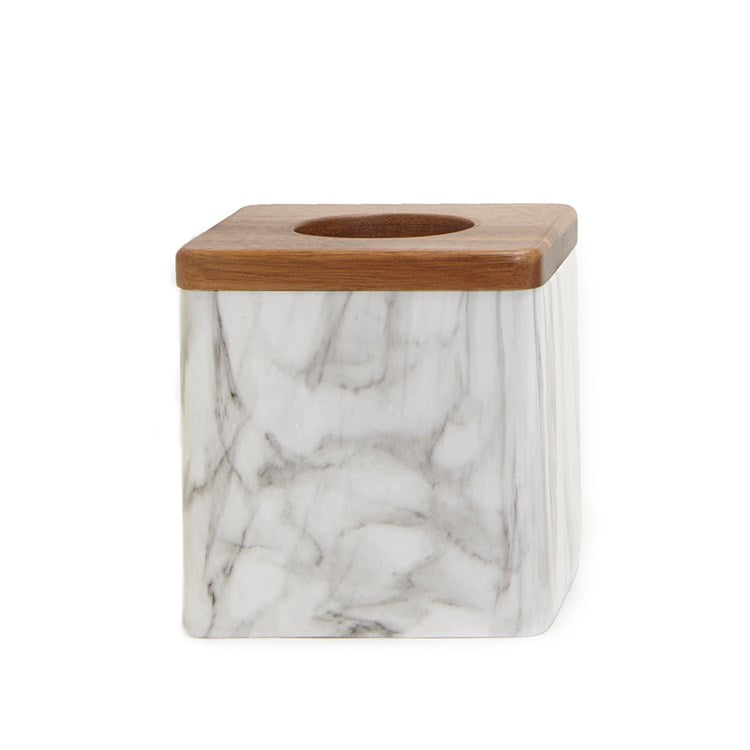 Made of polyresin carrera marble with acacia wood accents. Elegant and modern.
