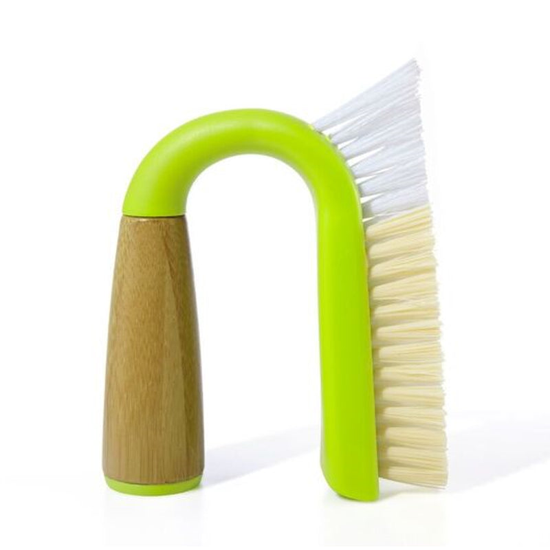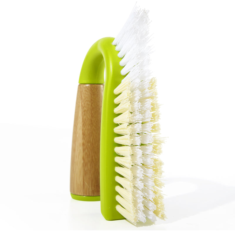 Grout & Tile Brush, 4.5 x 5.5" / 12 x 11.5cm, green, recycled plastic with bamboo handle. Designed to clean grout and tiles easily. Tough bristles for grout and soft bristles for tiles. Easy-grip handle allows for hard scrubbing. Stands on end for quick drying and prevents bacteria build-up.