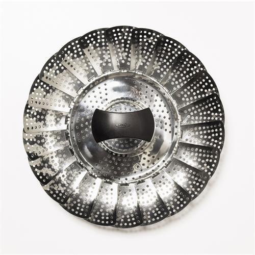 Pop-up steamer, 8" stainless steel. Pop-up handle for extended reach and compact storage. Fits pots 8" in diameter and up. Removable handle for large items. Fork hole in handle for extra reach. Dishwasher safe.