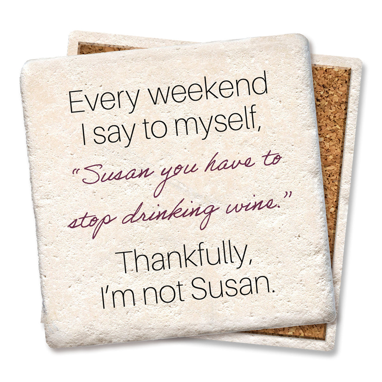 Funny and absorbent 4″ x 4″ coaster. Condensation disappears before your eyes! Printed with high-res graphics and humorous sayings that won’t fade or wear off. Made in America of smooth, thin, lightweight ceramic with full-coverage cork backing.