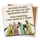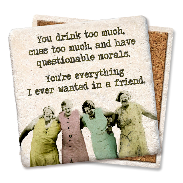 Funny and absorbent 4″ x 4″ coaster. Condensation disappears before your eyes! Printed with high-res graphics and humorous sayings that won’t fade or wear off. Made in America of smooth, thin, lightweight ceramic with full-coverage cork backing.