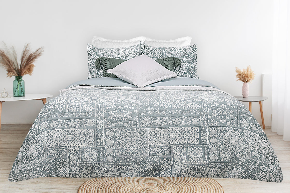 - 52% cotton, 48% polyester yarn dye Jacquard, reversible to solid green colour, 100% cotton percale, 200 thread count