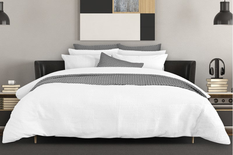 Multi-textured squares in whisper-soft white evoke a calm and refined glamour in perfect harmony!