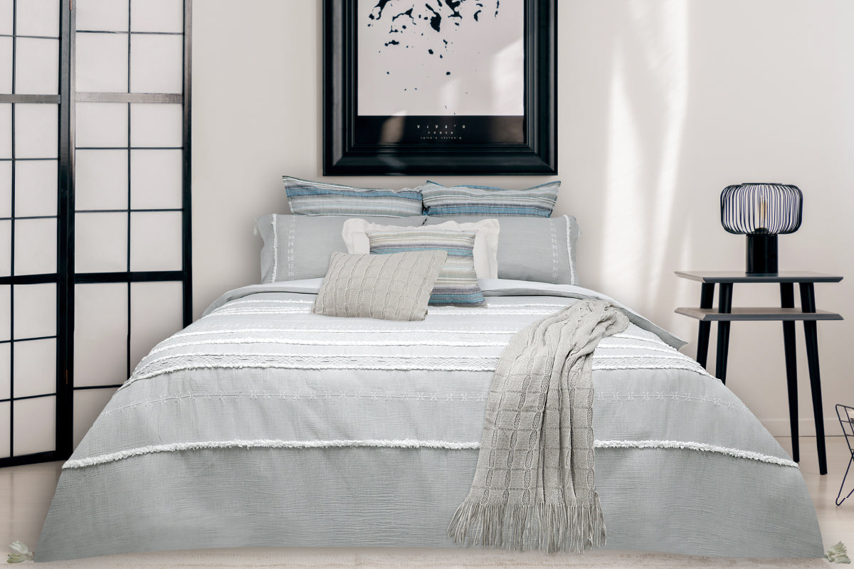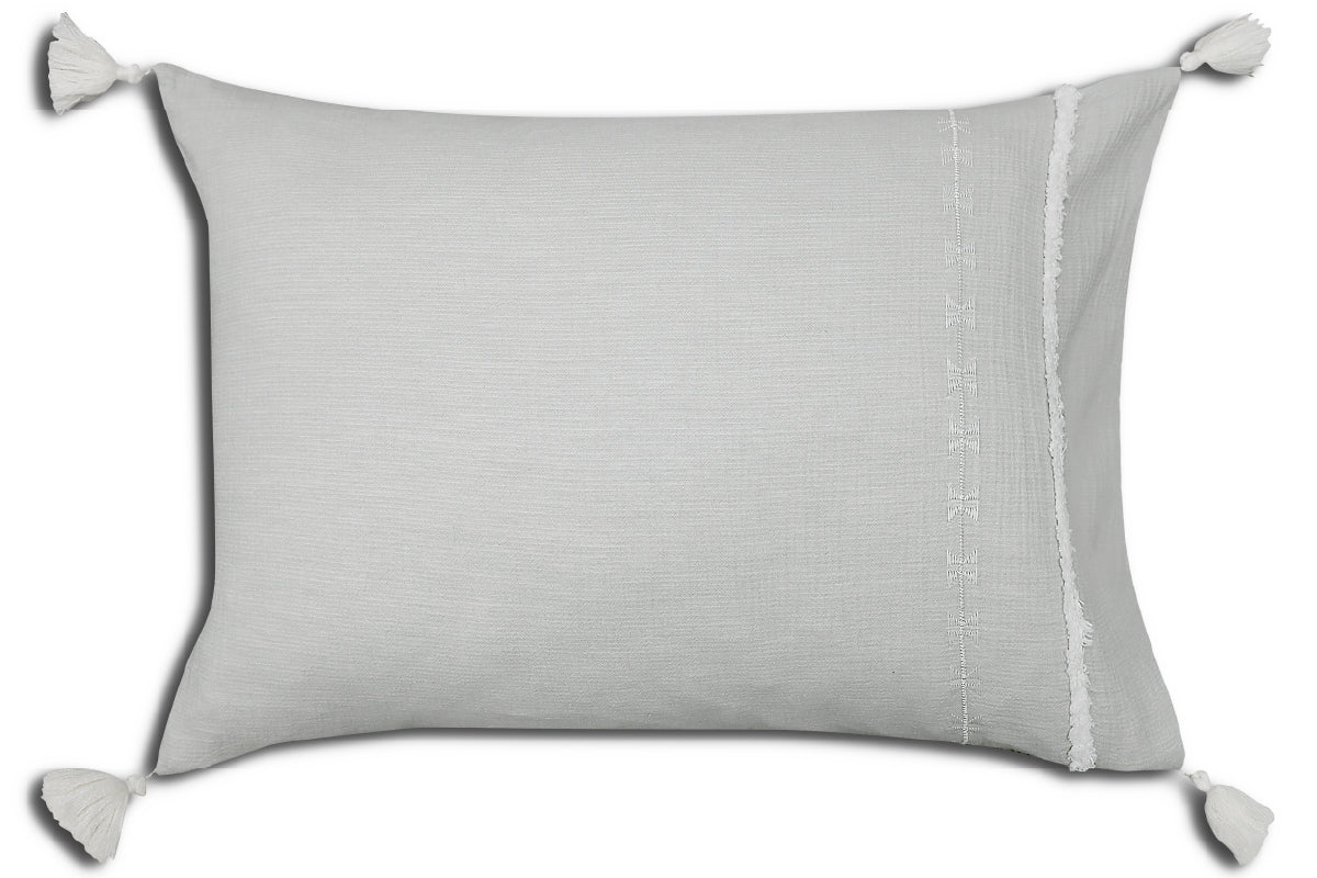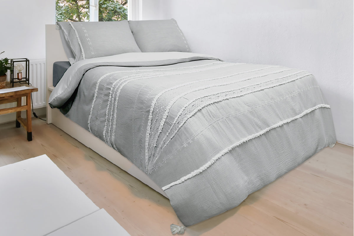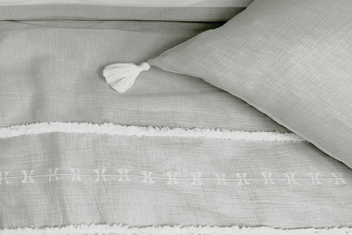 White chalk chenille lines aligned with embroidered geometric patterns on a light slate grey double layer of cotton muslin with tassels, make Lascau a classic and elegant choice.