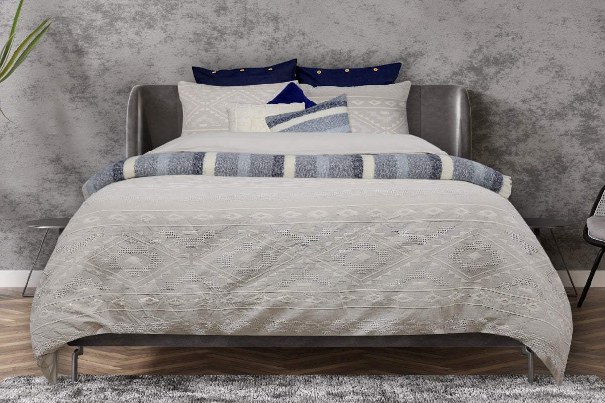 - 100% cotton yarn-dyed Jacquard, reversible to solid beige colour, 100% cotton percale, 200 thread count