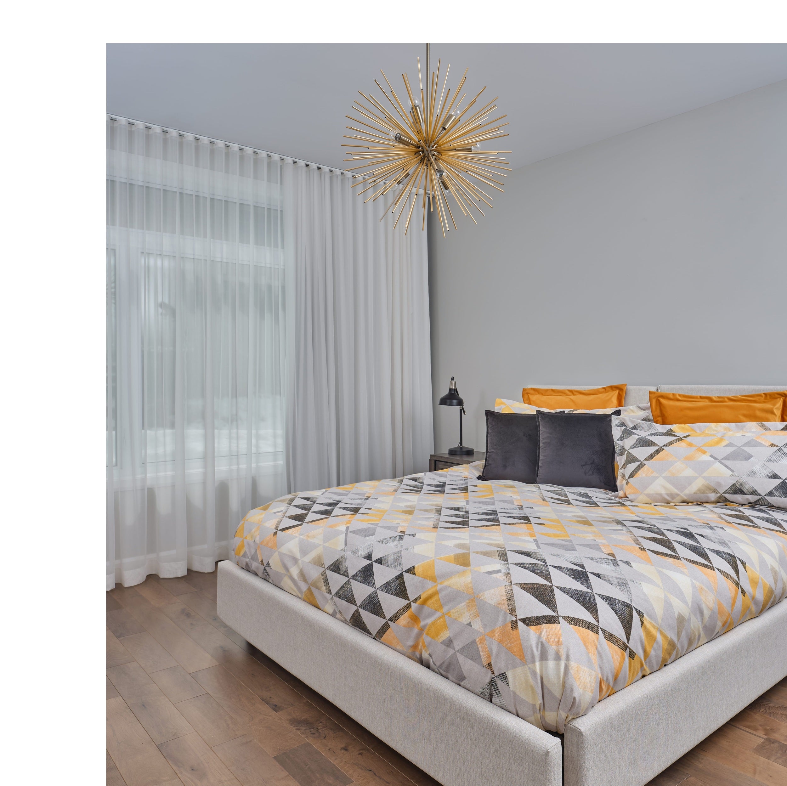 Your decor becomes a totally relaxing space where comfort go hand in hand with lasting beauty and easy care. This duvet cover features light grey, dark grey, and yellow triangles.