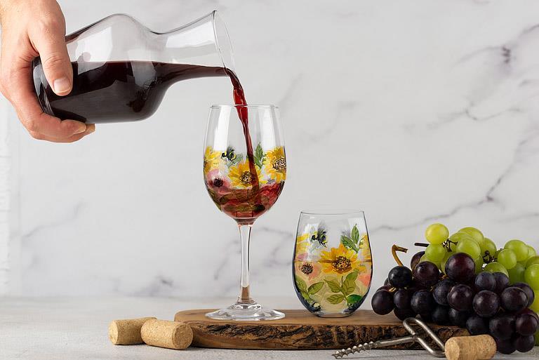 - This glass goblet delivers on sweetness with its beautifully painted scene of bees mingling in a crop of sunflowers – perfect for sipping and admiring.