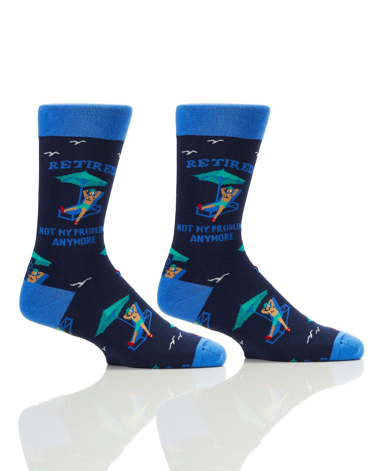 Men's Crew Sock with a RETIRED NOT MY PROBLEM ANYMORE sentiment. Compact cotton and anti-microbial. Reinforced deep pocket heel and toe. Fits Men's Shoe Size 7-12. Cotton.