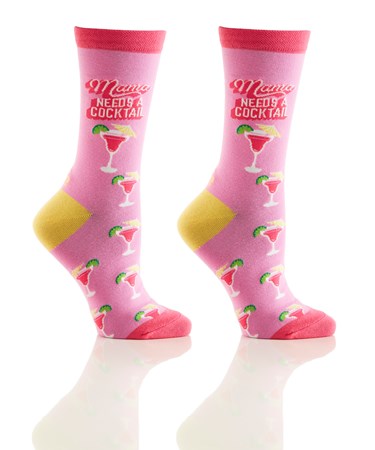 Women's crew sock with all-over martinis pattern with MAMA NEEDS A COCKTAIL sentiment.Compact Cotton and anti-microbial. Reinforced deep pocket heel and toe. Fits Women's Shoe Size 6-12.
