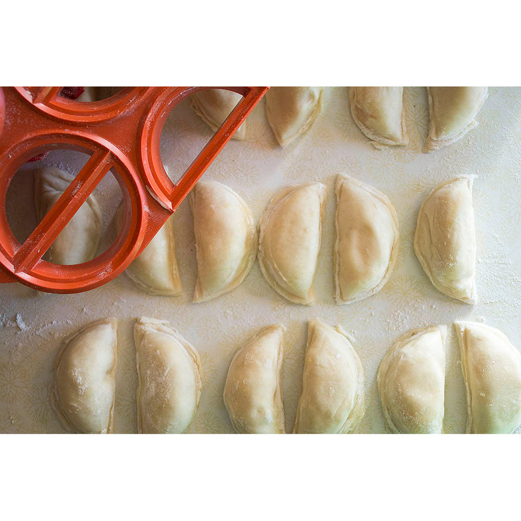 This easy to use perogie / pierogi maker from Hunky Bill's makes 18 perogies with a size of 3.2" (a little bit bigger than the perogies you would find in grocery stores). The perogie maker cuts, seals, and forms your dumplings. Use your favorite perogie recipes and make hundreds of delicious pierogies at a fraction of the cost you would have to pay in the stores. This perogie maker, which comes with a lifetime guarantee, is approved by experts and used by professionals. The Hunky Bills big perogie maker is proudly made in Canada.