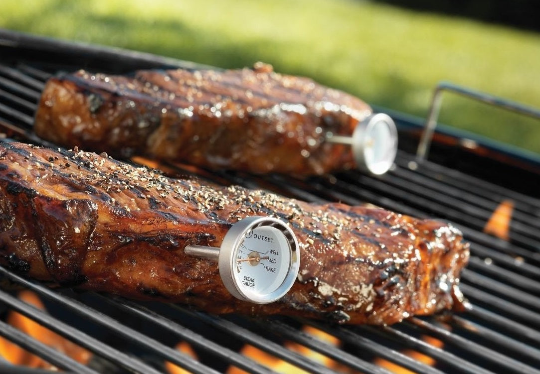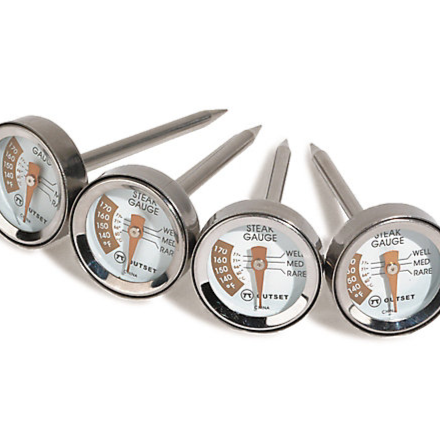 The thermometer displays the internal temperature of a steak in 15 seconds and has both Fahrenheit and Celsius markings, as well as Well, Medium, and Rare markings. The steak thermometers offer foolproof steak preparation.