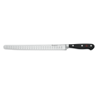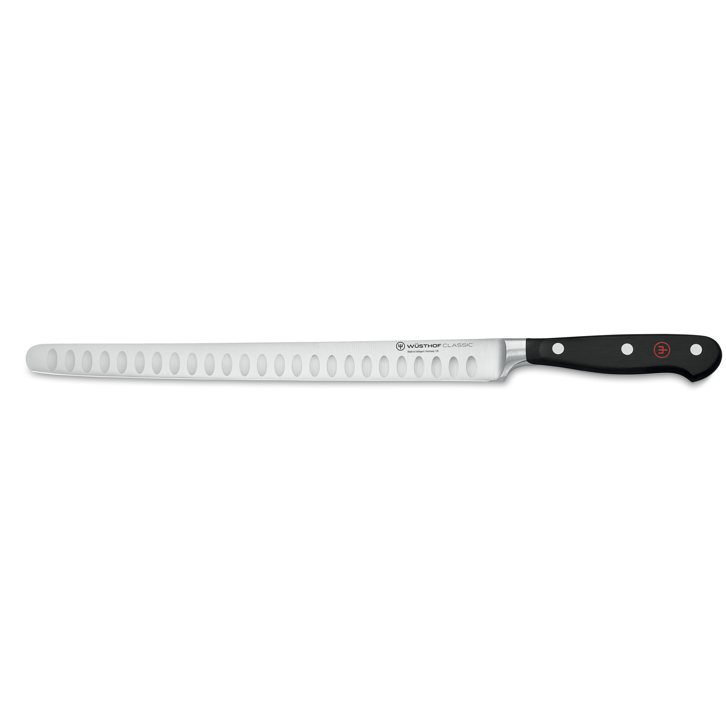 How did the WÜSTHOF Classic 10" Hollow Edge Ham Slicer earn its name? Its distinct shape and sharpness were designed for efficiently carving hard ingredients — especially your roasted holiday ham — into clean, even, wafer-thin slices. The hollow-edge creates tiny air pockets during slicing to prevent food from sticking, making this knife a versatile companion for carving roasts, fruits, and vegetables alike.