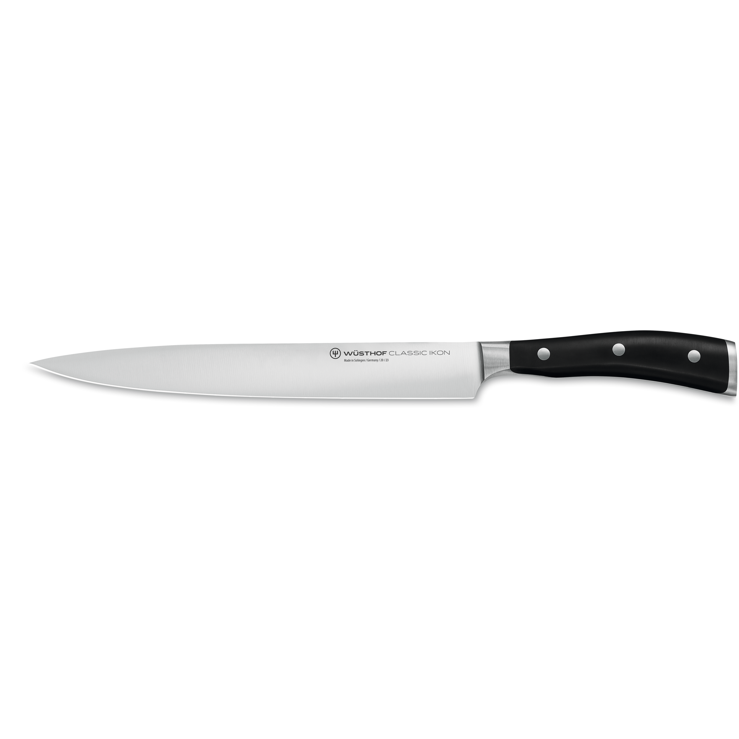 With a longer and narrower blade than a chef's knife, the WÜSTHOF Classic Ikon 9" Carving Knife features a distinct shape and sharpness designed specifically for expertly carving larger or tougher ingredients — a holiday roast, for example — into clean, even, wafer-thin slices. This carving knife is a versatile companion for carving roasts, fruits, and vegetables alike.