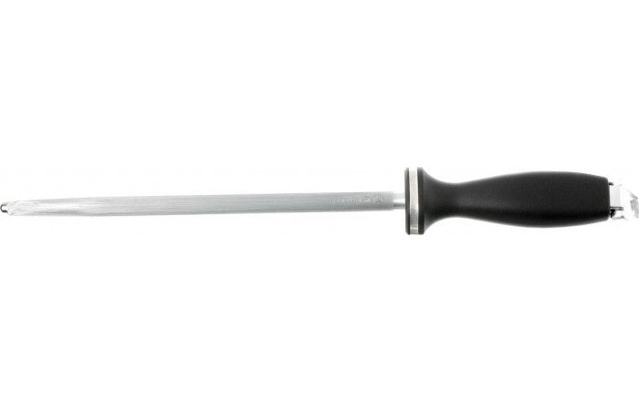 Conventional honing steels are made of steel that has ridges like a file. These ridges help remove burrs, a slight metal buildup, off the edge of a knife. Using this steel on a routine basis will help maintain the sharpness of a knife.
