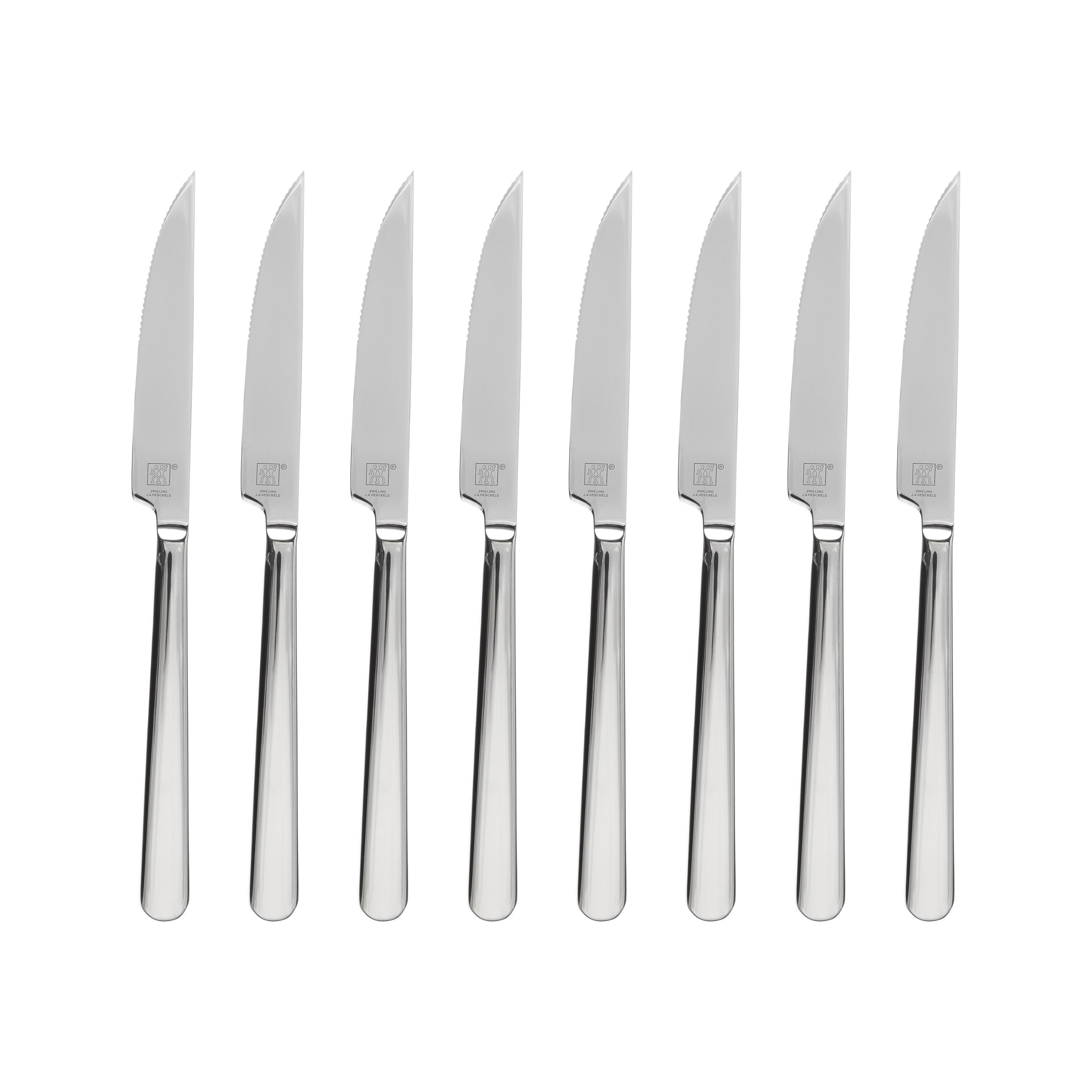 The Contemporary series of stainless steel steak knives complement the dining table and are designed to match other flatware. Used to cut cooked material too difficult for a butter knife like steaks or hard root vegetables. These steak knives incorporate serrations for lasting cutting performance - fine edge versions make cleaner cuts but require regular edge maintenance to compensate for the hard, dulling surface of dining plates.