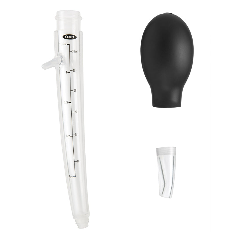 • The baster includes a wire cleaning brush and comes apart for easy cleaning.