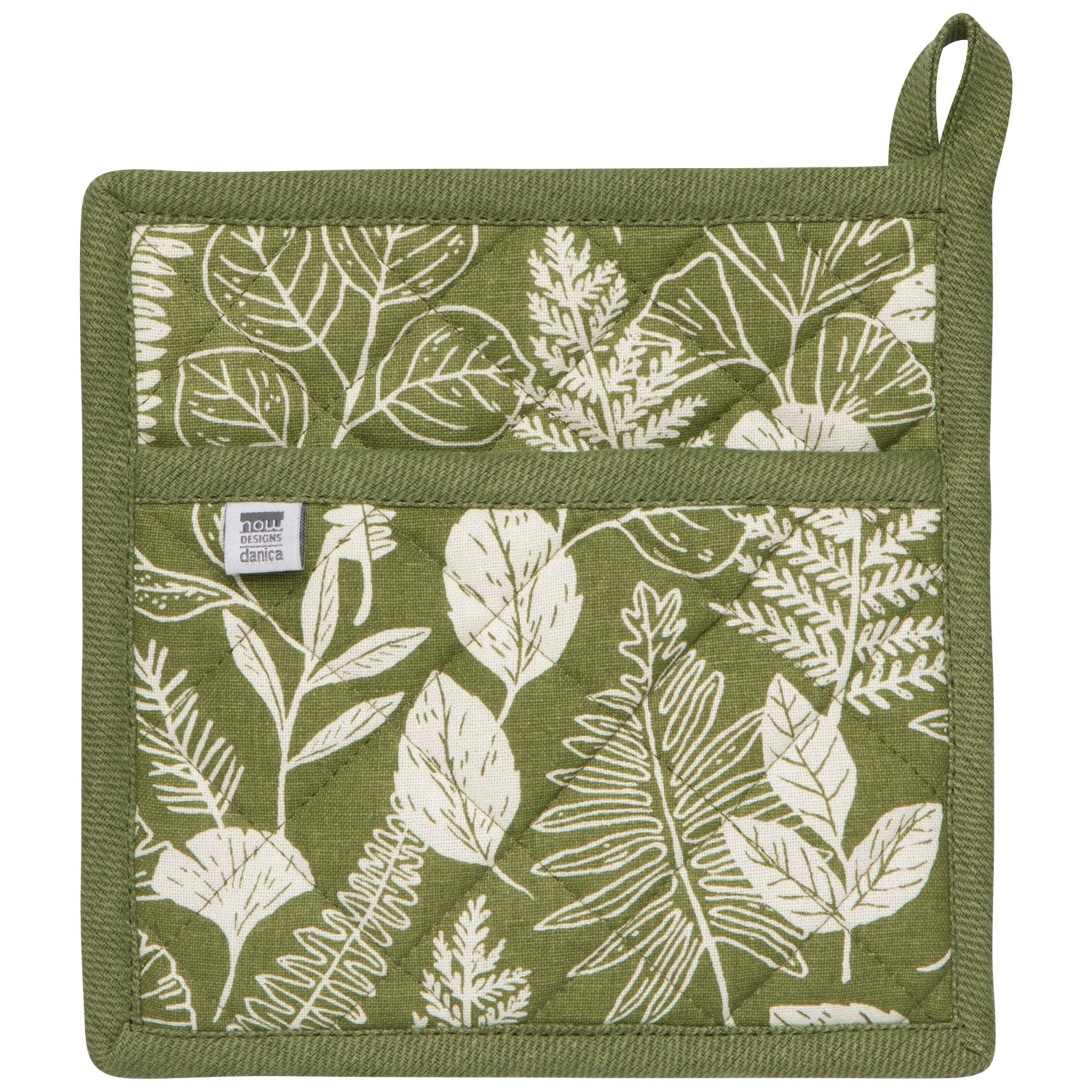 This classic Fern & Frond Spruce potholder offers major heat protection while lifting and moving items from your stove or oven. Made from 100% cotton, it measures 8 by 8-inches square. A lush ode to nature, Fern & Frond features layered leafy botanicals in earthy green and soft cream. Enduringly fresh, this collection pairs organic elegance with modern color blocking for year-round beauty.