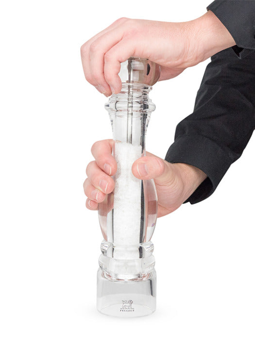 - Created completely in acrylic, the Peugeot Nancy salt mill highlights its contents and the mineral whiteness of the salt.