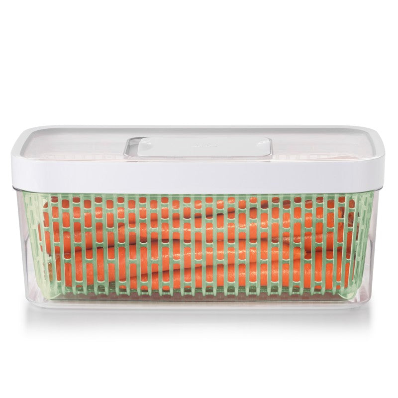 - The container has an elevated, removable basket that promotes proper airflow and helps prevent moisture buildup by lifting produce up and away from the bottom and sides of the container. This basket can also be used as a colander to rinse fruits and veggies.