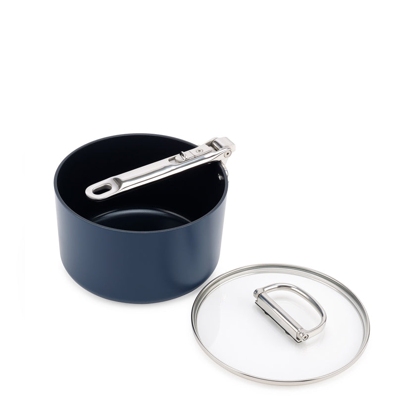 - Non-stick Saucepan & Tempered Glass Lid, with folding handle.
