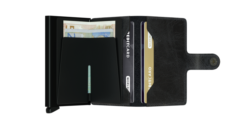Small in size and surprisingly large in storage capacity, the Miniwallet combines the best of both worlds. The exterior holds banknotes, receipt and cards, while the aluminium Cardprotector allows you to slide out cards with one simple motion and protects them from bending, breaking and unwanted wireless communication.