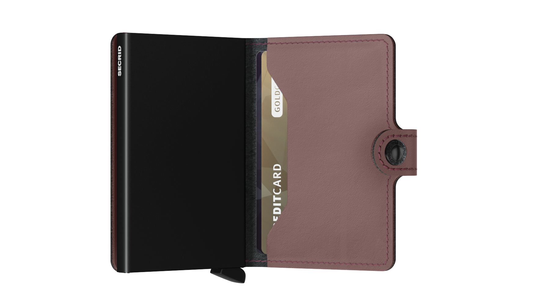 The Miniwallet's features a button to close hold the wallet closed.