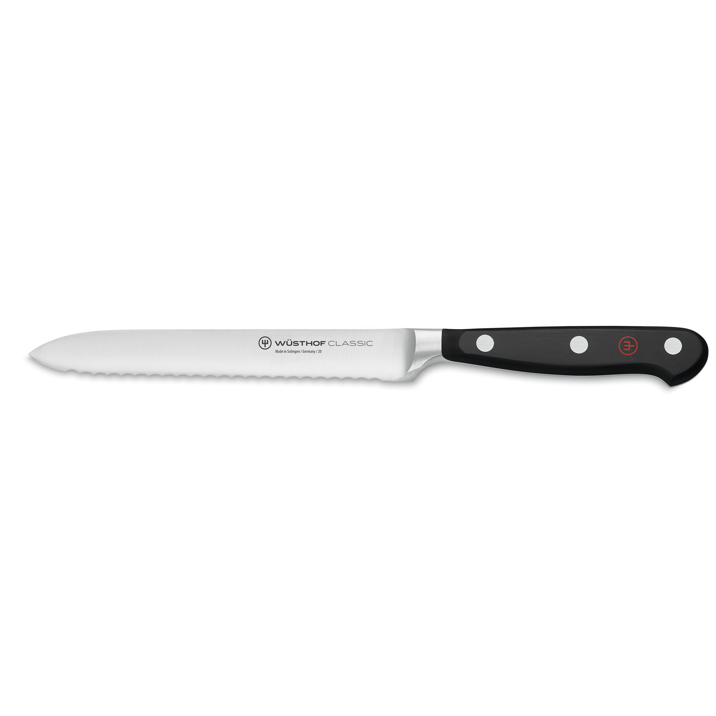 The perfect companion at brunch or for preparing your packed lunch! Thanks to its fine, serrated edge, the WÜSTHOF Classic Serrated Utility Knife not only cuts cleanly through sandwich rolls without tearing, but it is also suitable for vegetables (such as firm tomatoes), fruit, or dry sausages. This serrated utility knife is ideally found alongside the WÜSTHOF Classic Soft Cheese Knife or the WÜSTHOF Classic Hard Cheese Knife.