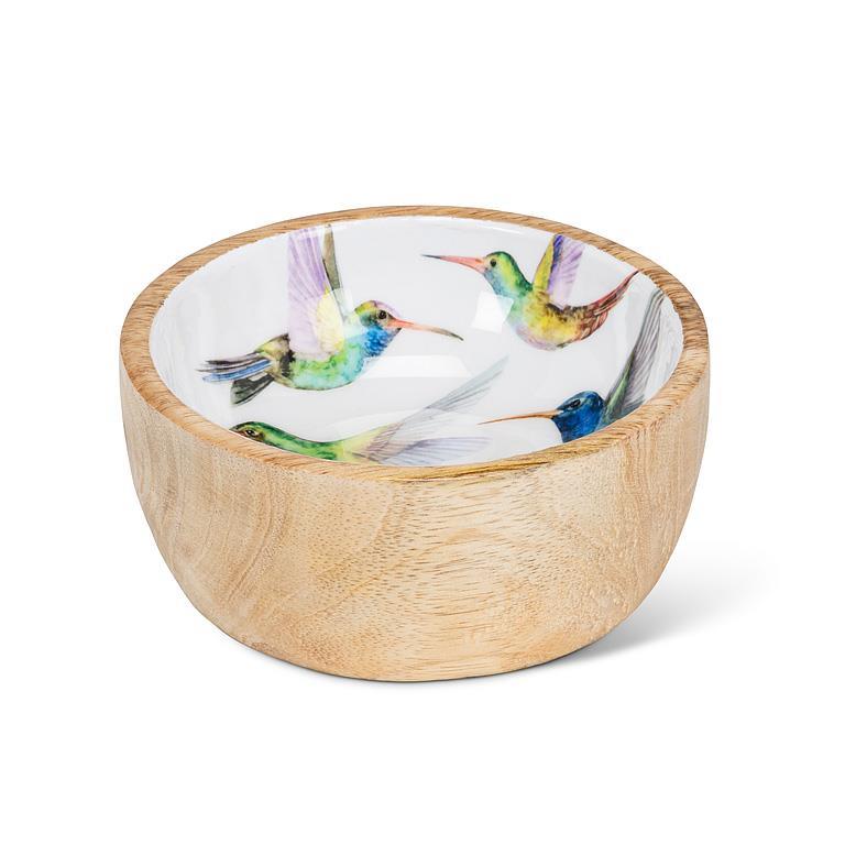 - Its smooth, hand-finished exterior highlights the beauty of the wood, while the printed enamel interior features a pattern of hummingbirds.