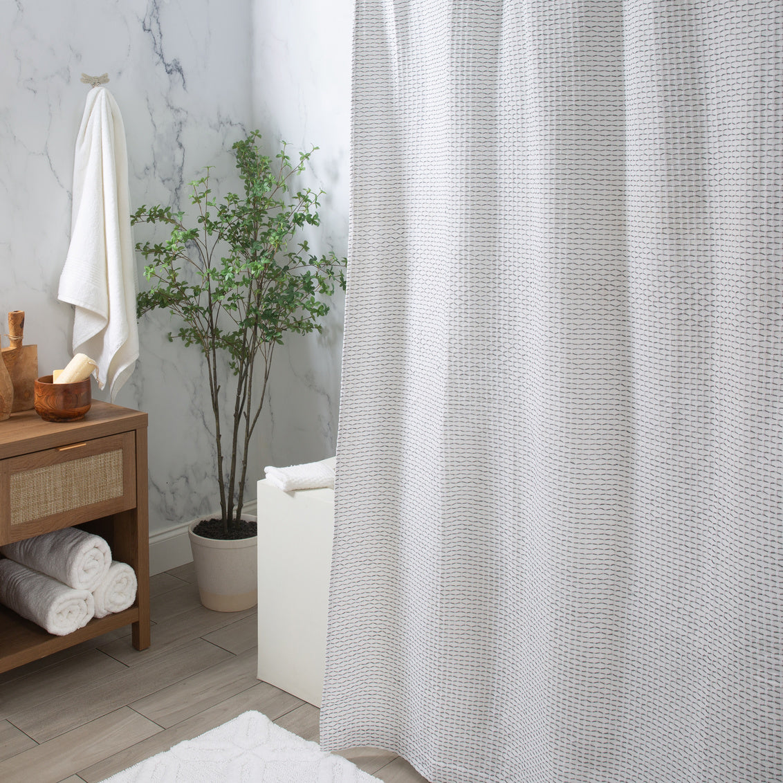 - Elevate your bathroom ambiance with the luxurious appeal of this 100% cotton honeycomb shower curtain, meticulously crafted to emanate a high-end designer aesthetic.