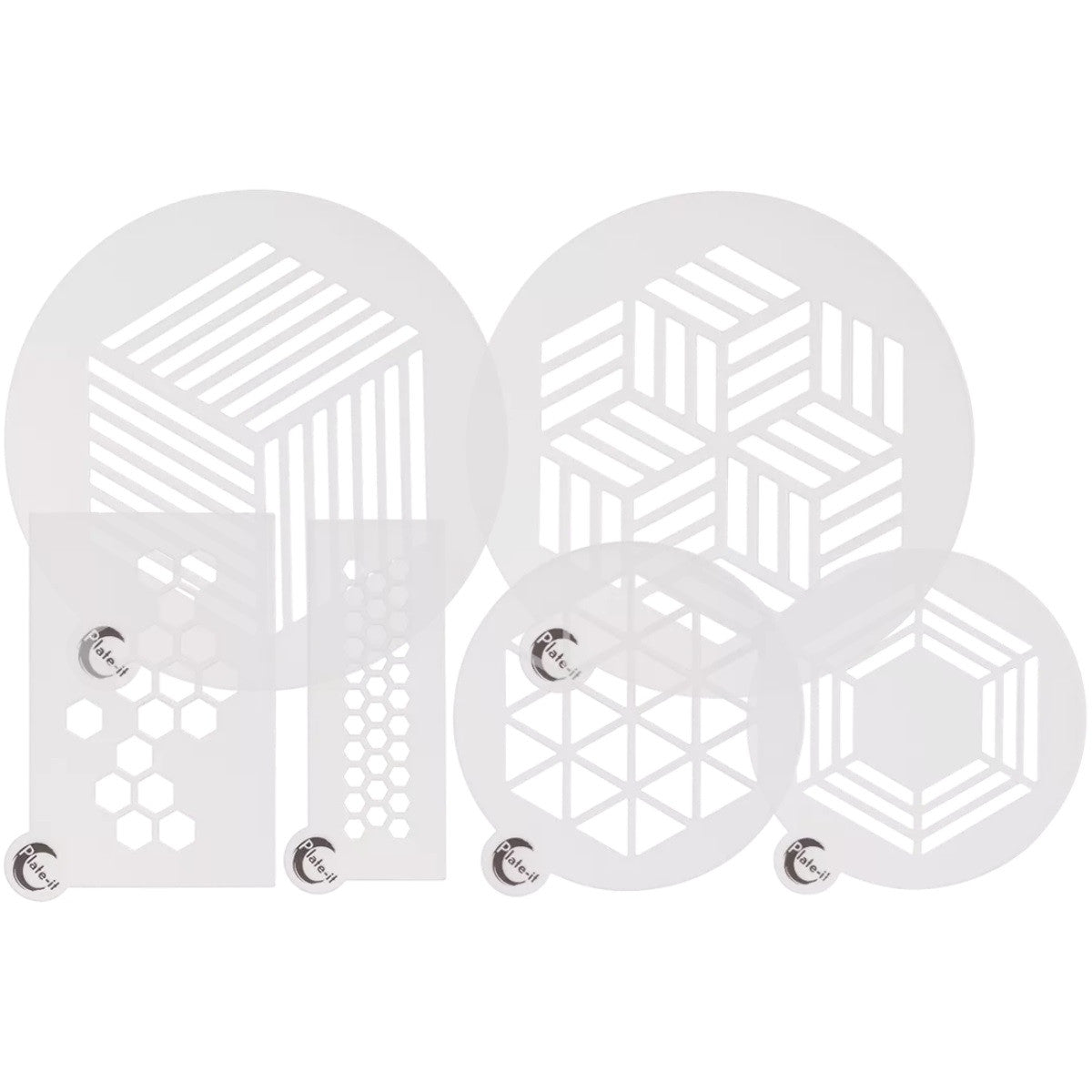 The Plate-it Stencil Hexagon Set/6 consists of 6 different stencils. It's perfect for not only elevating your plates, but also ideal for baking!