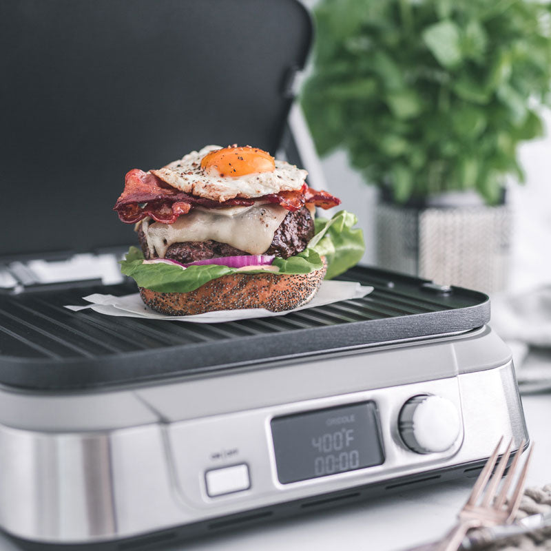 Countertop cooking on a whole new level! Designed for ultimate versatility with reversible plates and a floating cover turn this single appliance into a grill, griddle, contact grill and panini press! You can even position plates to do half grill/half griddle! Plus, the digital display makes it easy to program options and monitor timing.