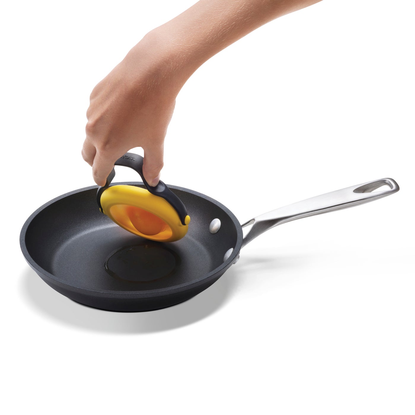 - Flexible egg ring shape holds the cooked egg, and the bendable handle enables the squeeze to drop feature to easily move cooked eggs from the pan to the plate.