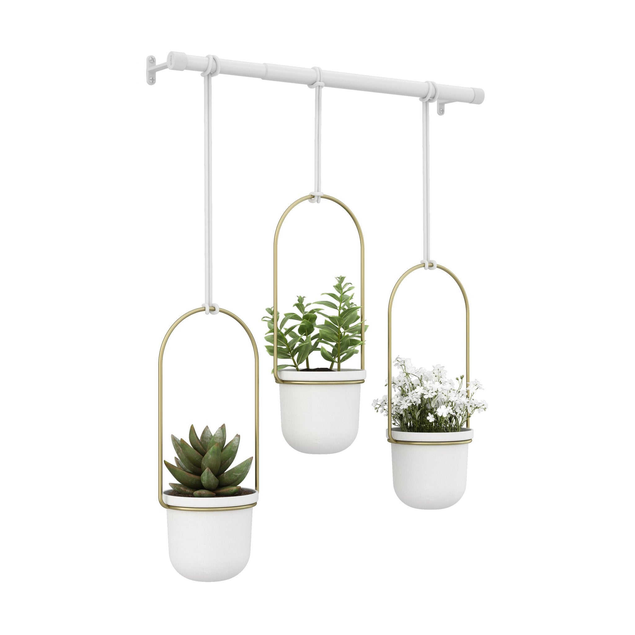 Triflora is a hanging planter for indoor plants that combines the utility of a drapery rod with the beauty of potted plants. Great for herbs, succulents, vine plants and more, Triflora Hanging Planter mounts to your wall or ceiling and adds functionality to your window by turning it into a space for growing plants. You can adjust the length of Triflora’s ropes and slide them anywhere along the metal rod to customize the position of each hanging pot. The durable melamine pots can fit standard 3-inch diameter pots (so there’s no need for re-potting)