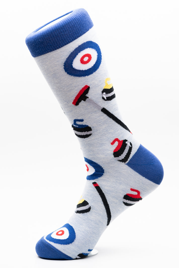 Did you know curling is a sport where players on teams slide stones on a sheet of ice to get as close as possible to a target? Stones are slid across the ice using brooms. We've got fun crew socks for all the curling players and curling followers out there.