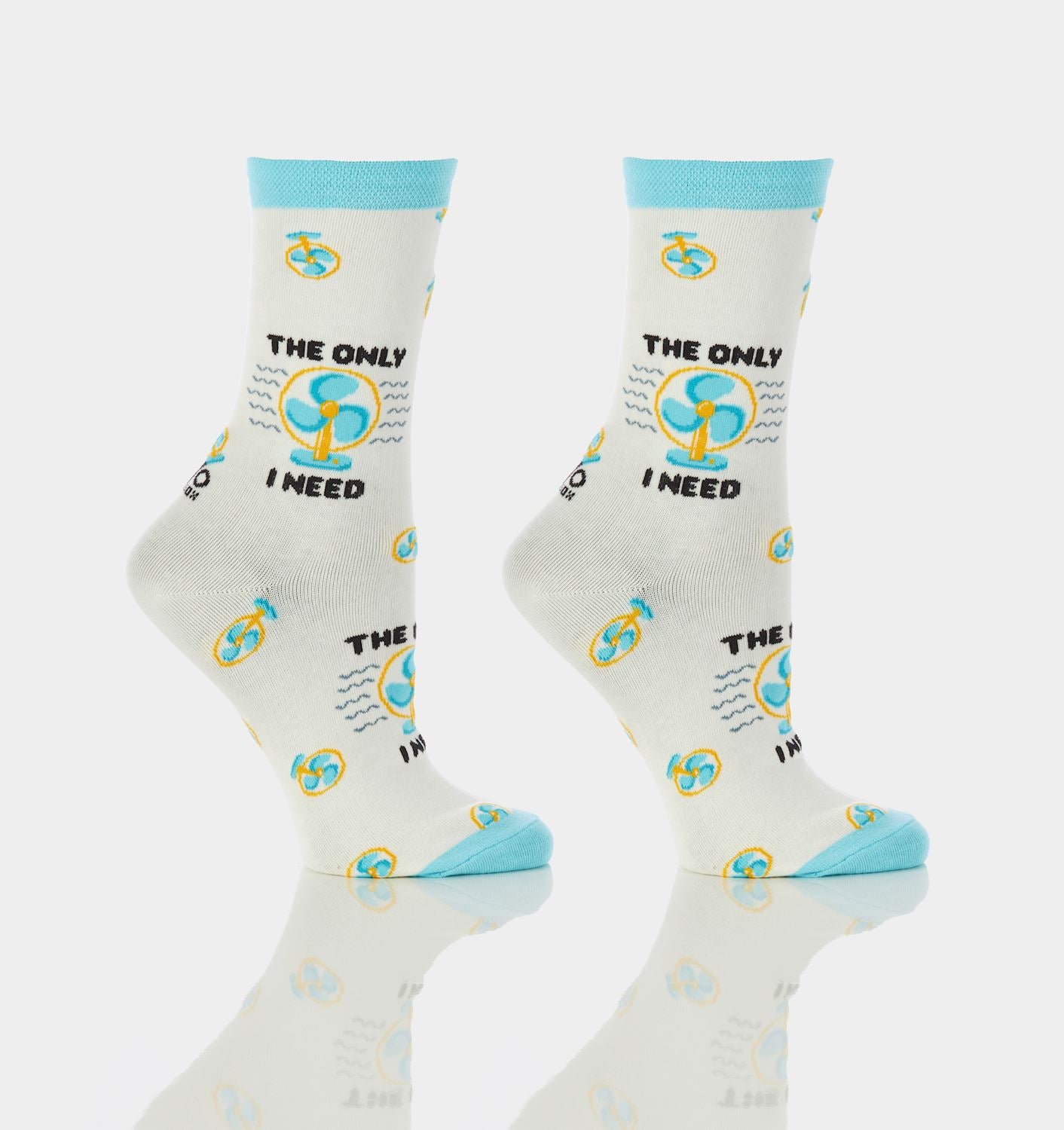 Women's crew sock with blue and yellow fan designs and THE ONLY FAN I NEED sentiment. White sock with white heel, and ocean blue cuff and toe. Compact cotton and anti-microbial. Reinforced deep pocket heel and toe. Fits women's shoe size 6-10.