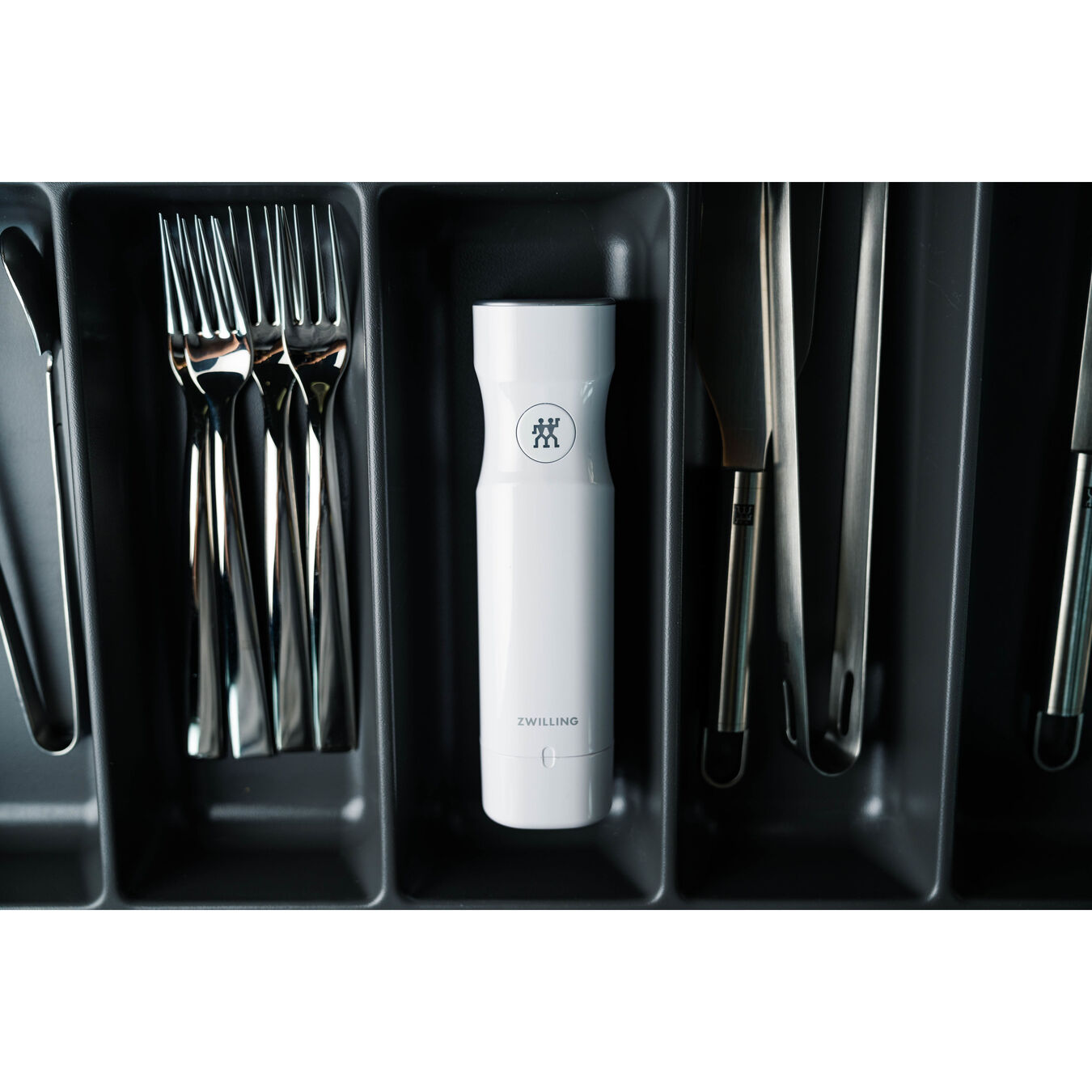The Fresh & Save vacuum pump is at the heart of the smart storage system by ZWILLING. The sleek, quiet, cordless vacuum pump extracts the air out of our vacuum containers and bags in just seconds and preserves aromas and vitamins. It stops automatically once a sufficient vacuum has been created. Equipped with a long-life lithium-ion battery, the pump can be charged quickly using the included USB via the charging socket located on the pump.